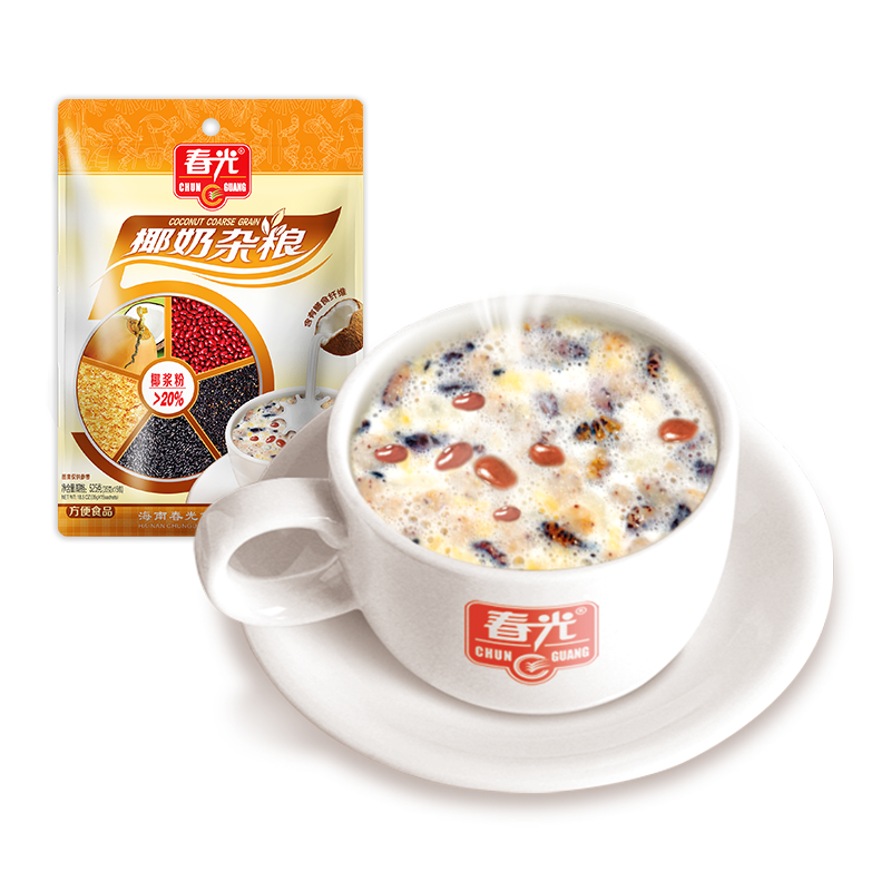 椰漿粉(20.5%)(椰子原汁、麥芽糊精、酪蛋白酸鈉、大豆磷脂、單,雙甘油脂肪酸酯、卡拉膠、辛烯基琥珀酸淀粉鈉、D-異抗壞血酸鈉)、白砂糖、植脂末、玉米、糙米、黑米、馬鈴薯淀粉、燕麥、麥片(小麥、燕麥、玉米、大豆)、乳粉、黑芝麻。