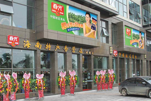 春光海南特產(chǎn)旗艦店坐落于三亞市河西路——黎客國際大酒店(準五星級)的一樓商鋪。由春光食品投資300多萬精心裝修成立,旗艦店面積約700平方米,是海南規(guī)模最大、最高檔的春光特產(chǎn)專營店。店內(nèi)商品陳列錯落有致,色彩搭配賞心悅目,除春光食品特產(chǎn)外,還設有水晶珠寶精品專柜、特產(chǎn)茶煙酒專柜、海產(chǎn)干貨專柜、速食飲料專柜、珍珠化妝品專柜等,并銷售海南花梨、牛角雕、貝藝工藝品、椰雕、島服泳裝、箱包、墨鏡等,經(jīng)營品種多達十幾個門類,上千個品種,滿足了消費者一站式購物的需要。是純玩團、會議接待等旅游休閑購物的理想選擇。物品便利、寬敞、舒適、明亮的購物通道和清楚的賣場標示,快捷的電腦收銀、便利的大巴停車空間,亮潔的化妝間,為游客提供干凈舒適并具現(xiàn)代感的購物環(huán)境。