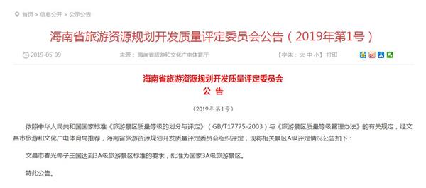 公告稱,依照中華人民共和國國家標(biāo)準(zhǔn)《旅游景區(qū)質(zhì)量等級的劃分與評定》(GB/T17775-2003)與《旅游景區(qū)質(zhì)量等級管理辦法》的有關(guān)規(guī)定,經(jīng)文昌市旅游和文化廣電體育局推薦,海南省旅游資源規(guī)劃開發(fā)質(zhì)量評定委員會組織評定,文昌市春光椰子王國達到3A級旅游景區(qū)標(biāo)準(zhǔn)的要求,批準(zhǔn)為國家3A級旅游景區(qū)。