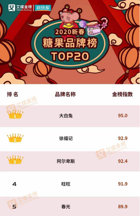 2020年1月10日,艾媒金榜聯(lián)合新快報發(fā)布了《2020新春休閑零食品牌》排行榜,春光食品以89.9的金榜指數(shù)摘得糖果品牌榜前五名,與大白兔、徐福記、阿爾卑斯、旺旺成為新春糖果五大品牌之一。