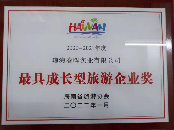 2022年1月7日,海南省旅游協(xié)會六屆二次會員大會暨2020-2021年度優(yōu)秀旅游企業(yè)和先進個人表彰大會在??谑谐晒φ匍_,瓊海春暉實業(yè)有限公司(春暉椰子文化觀光園)榮獲“最具成長型旅游企業(yè)獎”。