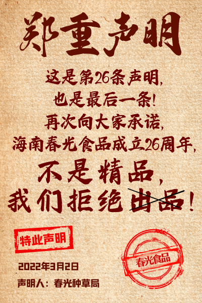 此外,春光食品在產(chǎn)品生產(chǎn)過程中推崇用好料、用足料、不忘初心、始終如一的研發(fā)和生產(chǎn)方針,產(chǎn)品拒絕添加香精、色素、防腐劑等,進(jìn)一步滿足了消費者對于健康飲品和美味的需求。