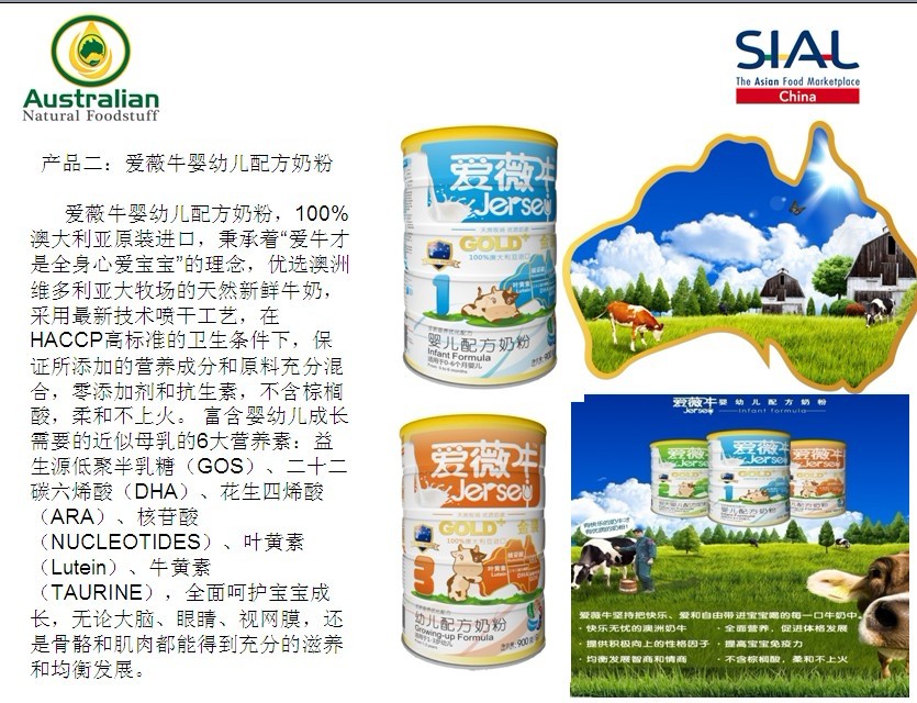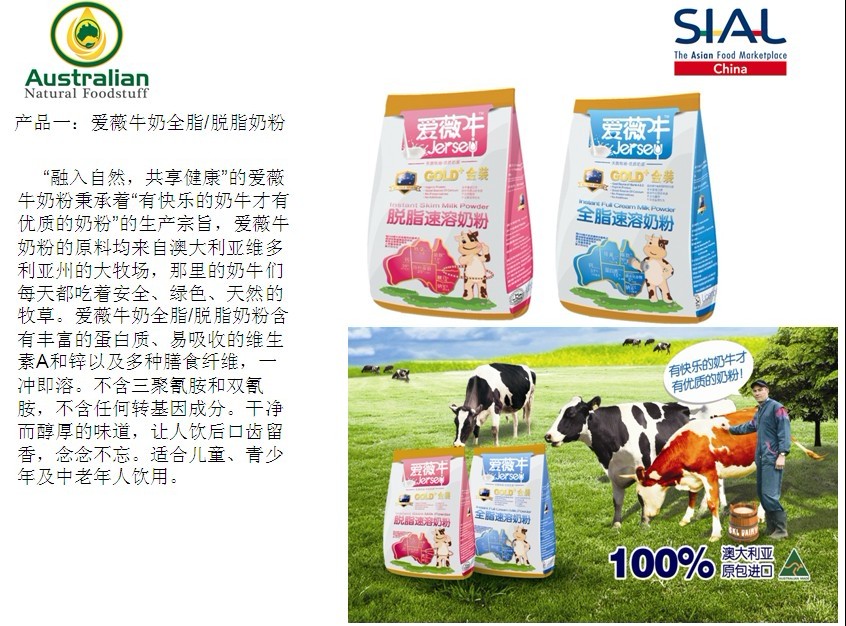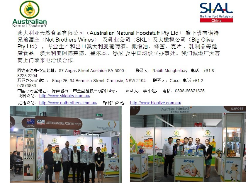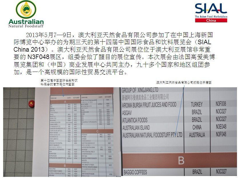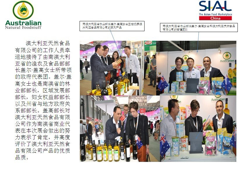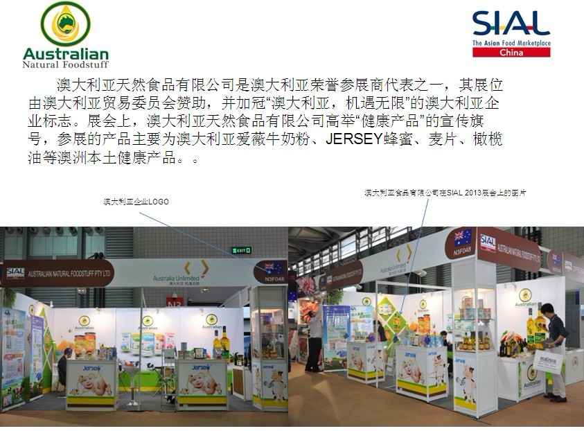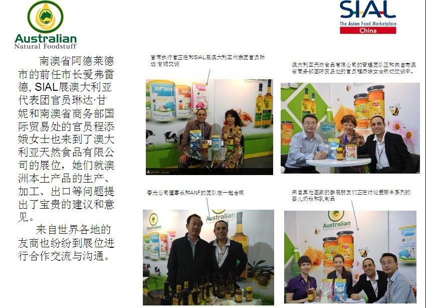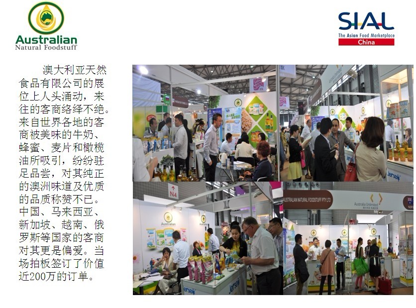 5月7-9日,第十四屆中國(guó)國(guó)際食品和飲料展覽會(huì)(SIAL China 2013)在上海新國(guó)際博覽中心舉辦。澳大利亞天然食品有限公司(Australian Natural Foodstuff Pty Ltd)攜其生產(chǎn)的高品質(zhì)的澳大利亞本土奶粉、橄欖油、蜂蜜、麥片等健康食品閃亮登場(chǎng)。本次展會(huì)由法國(guó)高愛(ài)美博展覽集團(tuán)和(中國(guó))商業(yè)發(fā)展中心共同主辦。九十多個(gè)國(guó)家和地區(qū)2000多企業(yè)參展,本次展會(huì)是一個(gè)高規(guī)模的國(guó)際性貿(mào)易交流平臺(tái)。